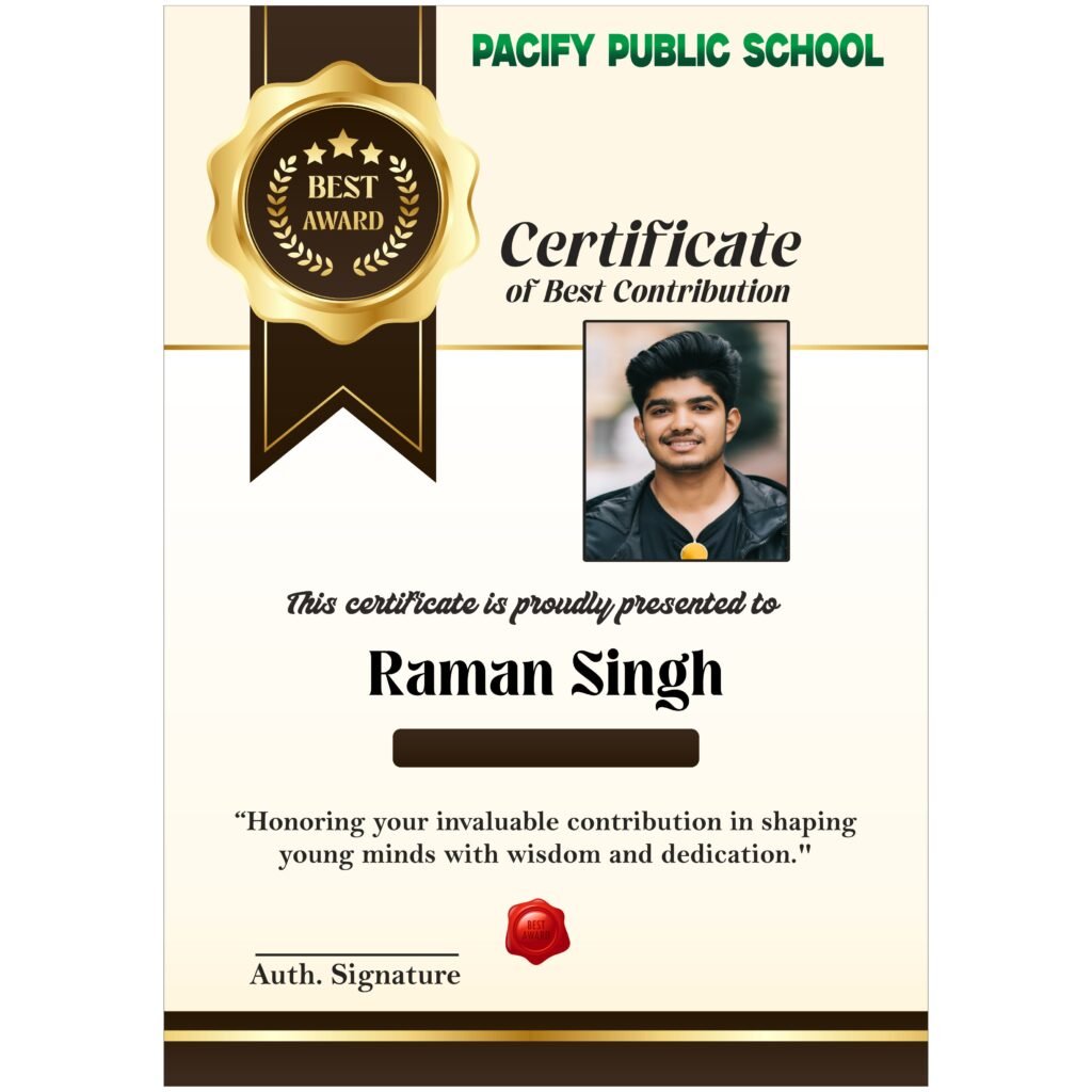 Celebrate Teacher’s Day in a special way with this beautifully designed Best Contribution Professional Certificate. This certificate is perfect for schools, colleges, and institutes to honor teachers for their dedication, hard work, and outstanding contribution in shaping students’ futures.